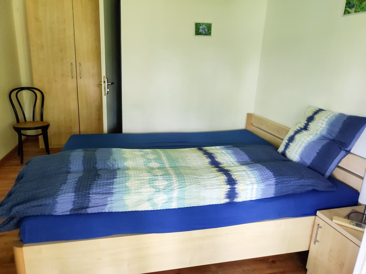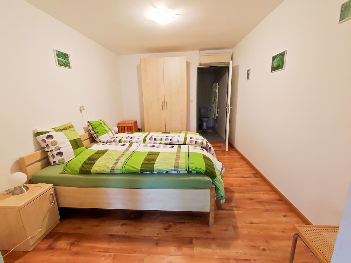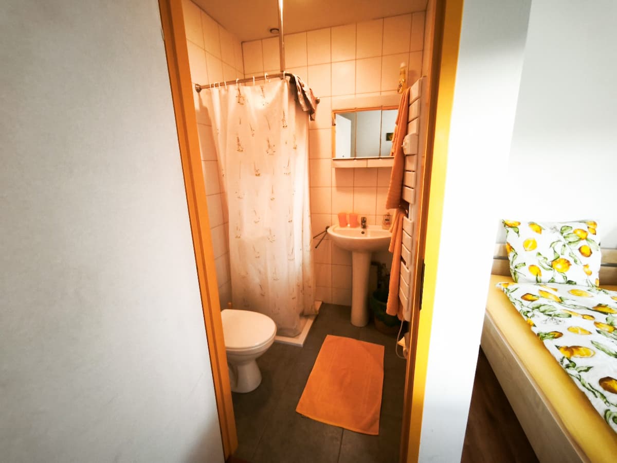 Die vier Zimmer der Sequoia‑Ranch sind schlichte, gemütliche Rückzugsorte mitten in der Natur. Jedes Zimmer ist als Einzel- oder Doppelzimmer buchbar und verfügt über ein eigenes Bad mit Dusche und WC sowie einen direkten Zugang zur grossen, überdachten Gemeinschaftsterrasse. Von dort öffnet sich der Blick weit über Wiesen und Wald, ein ruhiger, grüner Horizont, der zu jeder Tages- und Jahreszeit anders wirkt.